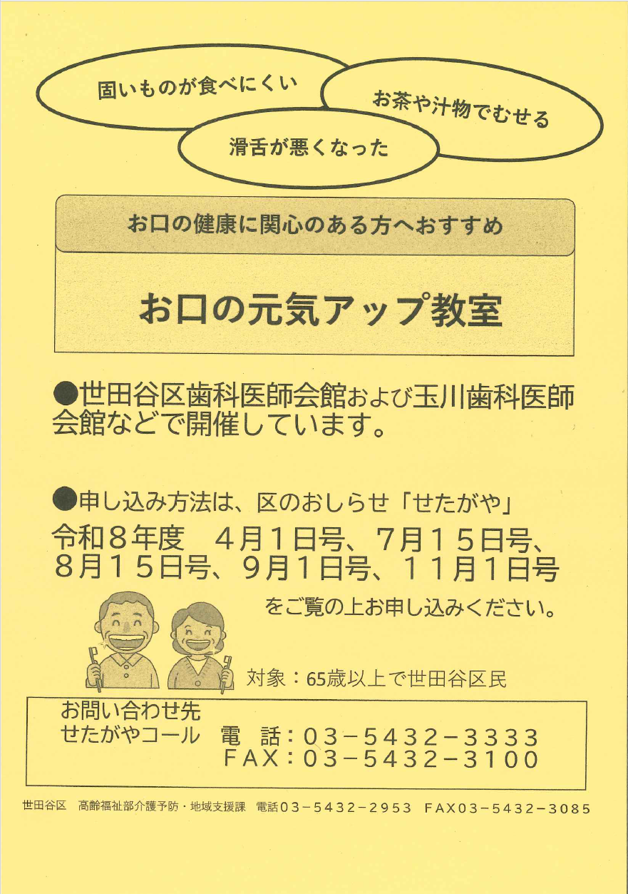 「お口のはたらき」についての講話、お口の中の検査・清掃方法、お口の体操等を学ぶ、全8回の講座です。